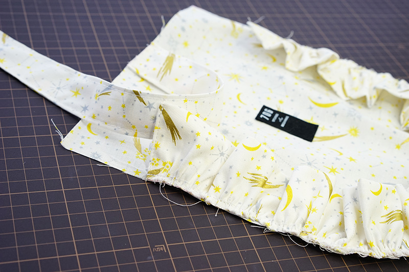 表布にタグを縫い付け、フリルと持ち手を仮どめします。このとき、フリルの端も縫っておきます。