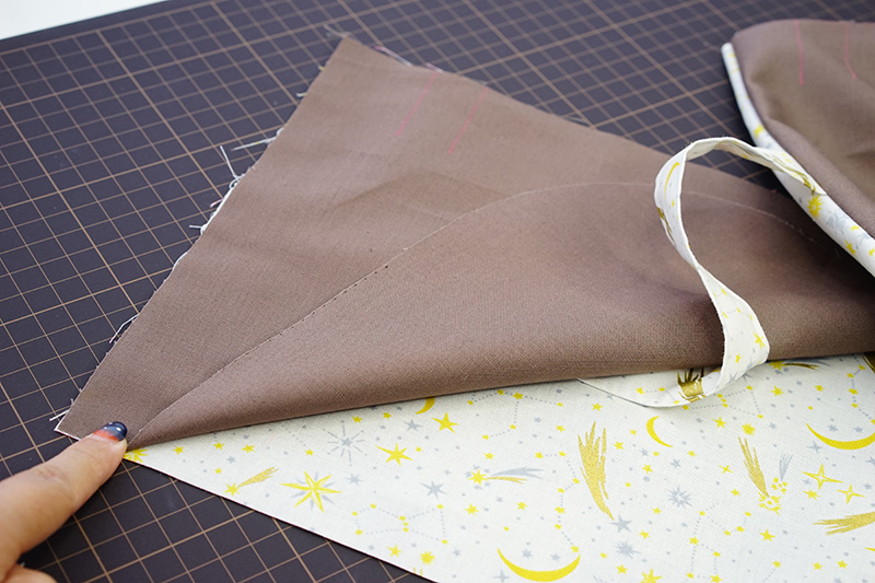 表布同士、裏布同士を中表に合わせ、表布の紐通し口と、裏布の返し口を残して縫います。