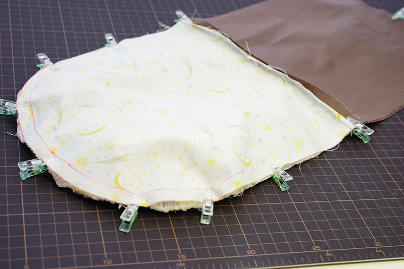 反対側も同様に、持ち手を仮どめし、表布と裏布を中表に合わせ、口側を縫います。