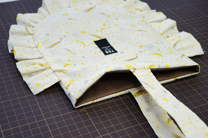 まあるいフォルムに沿って、ぐるりとたっぷりフリルをつけた巾着バッグです。使った布は、「Midnight」シリーズの夜空柄。星座や流れ星がちりばめられた小柄の総柄は、布の向きを気にせず使えます。コットン100%のシーチング。