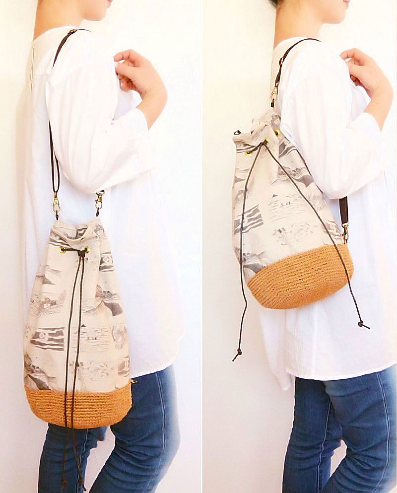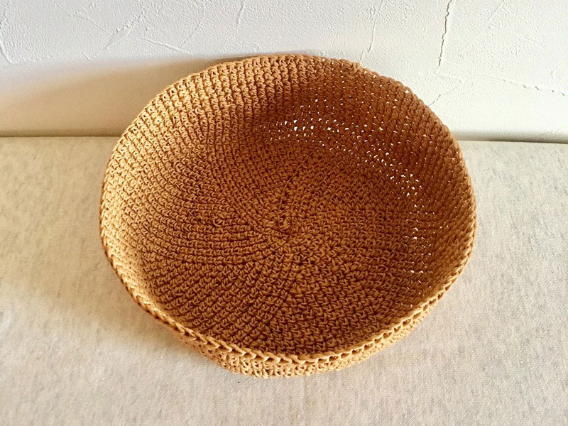 ベースがナチュラルカラーなので、引き立て役に麻糸で編む底を使いました。芯を使わなくてもしっかりするので、ミシンより時間は使いますが、おすすめです。