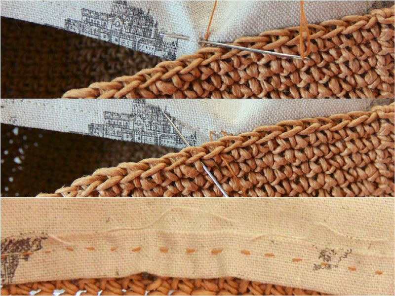 リュックにするためのDカンは、編地に編み糸でくくりつけます。