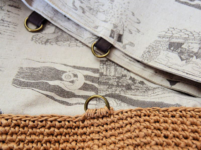 春先のお出かけにぴったりの巾着バッグです。ナチュラルトーンのファブリックに合うように、底部分を麻糸で編んだユニークな作りが素敵♩ 使った布は、イラストレーター・造形作家のmina chape(ミナ・チャペ)がデザインした「LAND WITH ANGELS」。18世紀にフランスで生まれたプリント、”トワルドジュイ”をイメージしたテキスタイルで、中世の教会の周りに、羊の群れや天使や月など、繊細な線画で描かれたファンタジックな柄です。