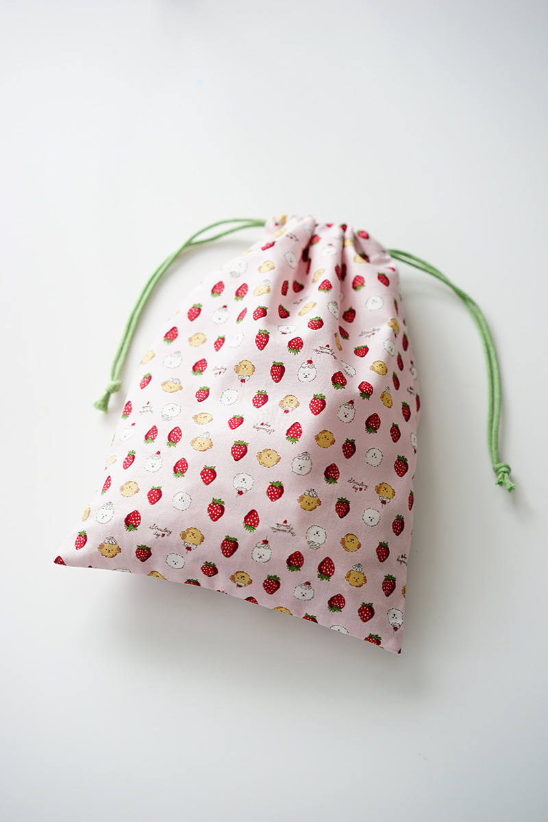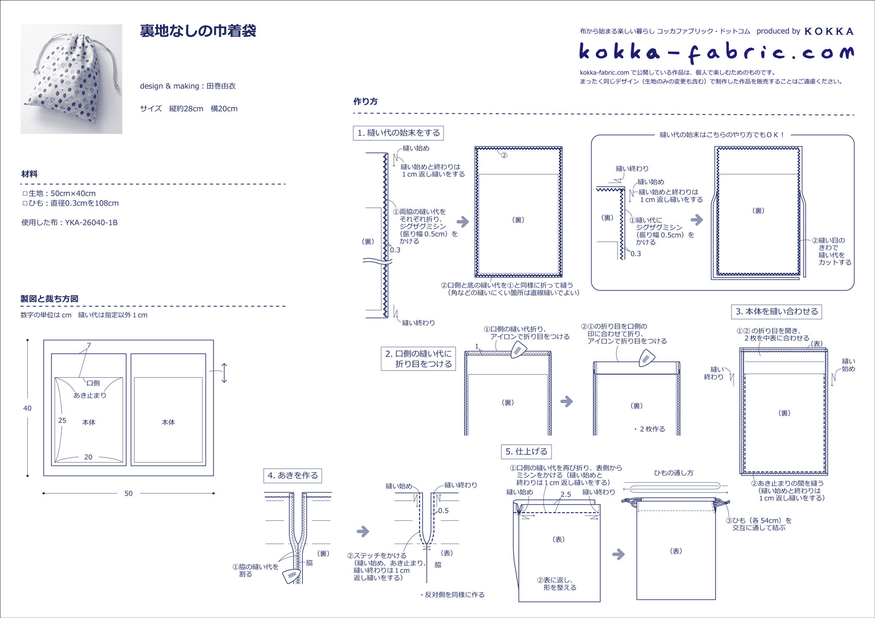 ミシンやおさいほうは初めて・・・。そんな初心者さんのためにソーイングの基礎を学びながら、作品づくりが楽しめるコーナー「初心者マークのソーイング」。第2回目は裏地なしの巾着袋の作り方を紹介します。使った布は、コットン100%のシーチングの「ちびプリ」シリーズ。小柄の総柄なので、布の方向を気にせずに作れて、初心者の巾着作りにおすすめです。