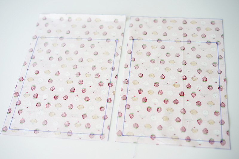 袋部分のでき上がりサイズ(横20cm縦25cm)に、縫い代をつけて線を描きカットします。※縫い代:入れ口側は紐通し分込み7cm。ほかは1cm