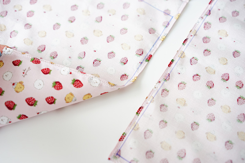 *動画では、まず、縫い代にジグザグミシンをかけ、余分な縫い代を裁つ方法を紹介していますが、今回使用した薄手の布の場合は、先に縫い代を折ってジグザグミシンをかける方法(PDFレシピで紹介)のほうが縫いやすいので、初心者さんにはおすすめです。