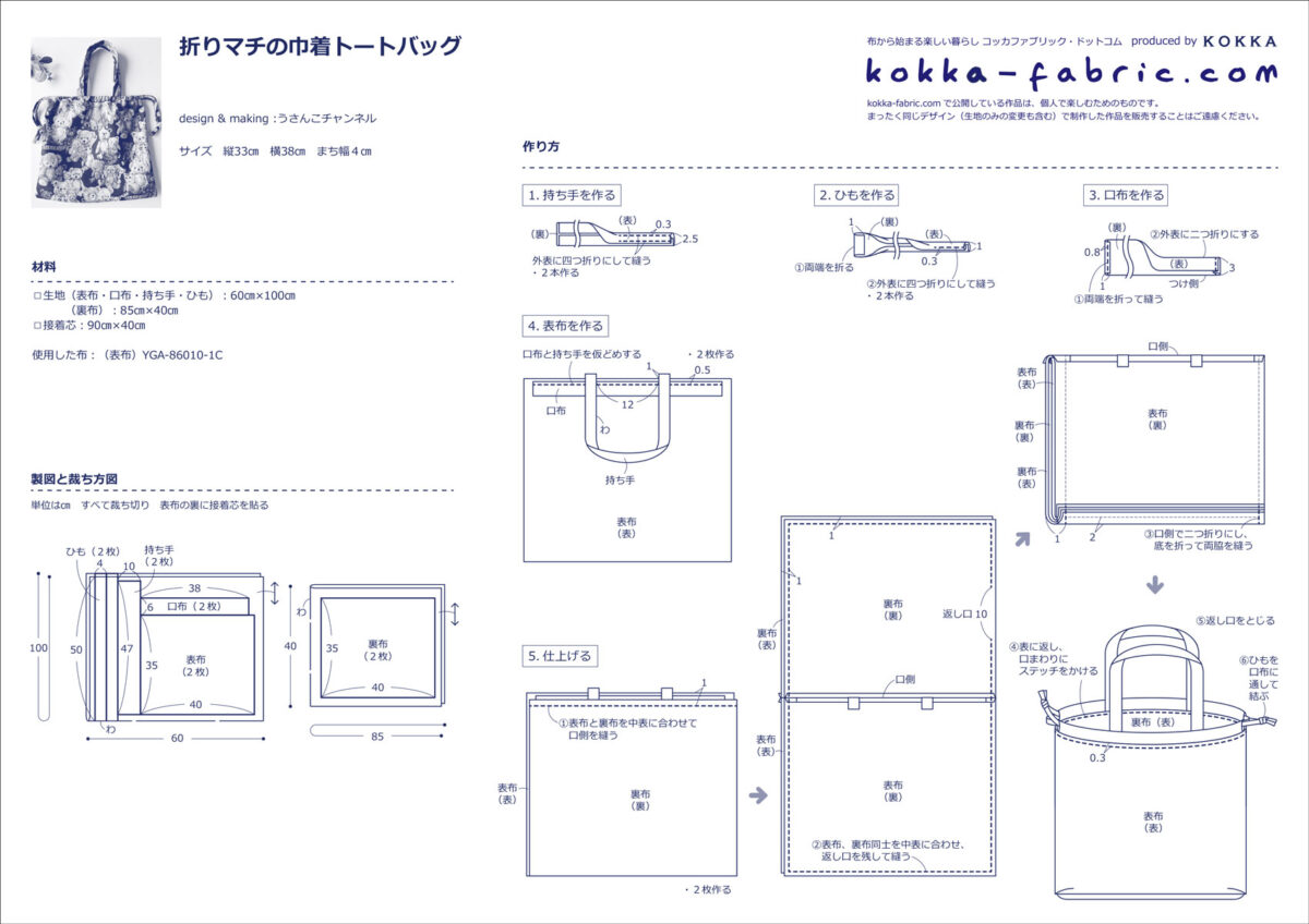 KF:うさんこチャンネルさん、どうもありがとうございました!折りマチの巾着トートバッグの作り方プロセスもうさんこチャンネルさんに撮影していただきましたので、ぜひ、作り方シート(PDF)と合わせて参考にしてくださいね。