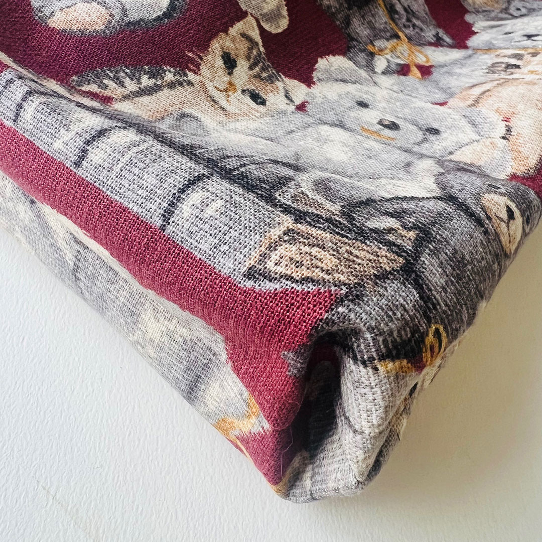 ゴブラン調のプリント生地で、見た目は重厚感がありますが、実際は軽くて縫いやすい素材です。織りのような立体感があり、プリントとは思えない高級感が魅力。深いワインレッドの地色に、クラシックなテディベア柄が映えて、季節感のある可愛らしさを演出してくれます。