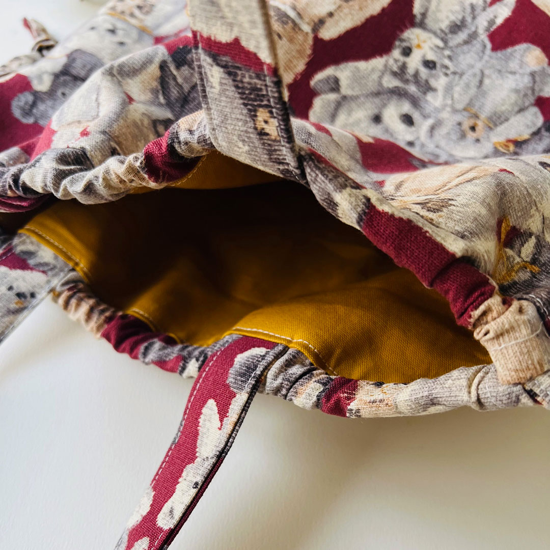ひもまで手作りした巾着トートです。布に適度なハリを出すため、織物接着芯を貼っています。これにより形がきれいに保たれ、バッグとしての安定感がアップしました。裏布にはライトブラウンのコットンを合わせて、開けたときに温かみのあるコントラストを楽しめるようにしています。
