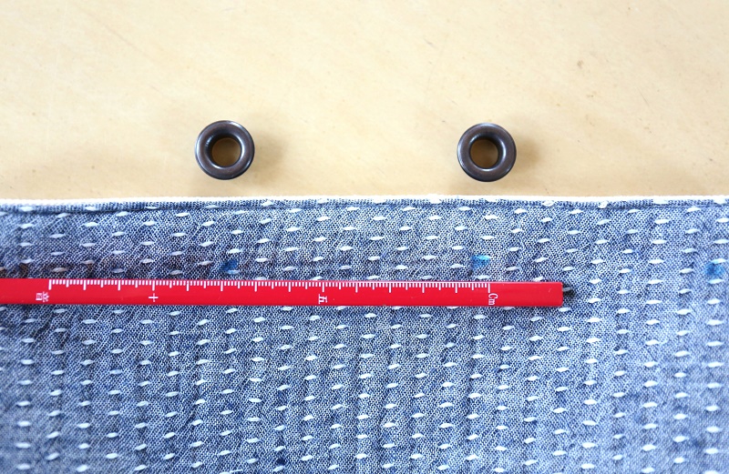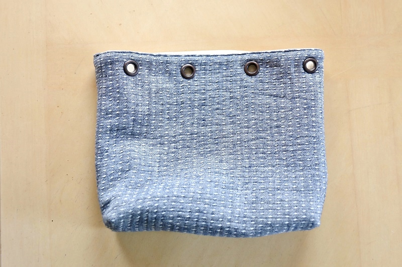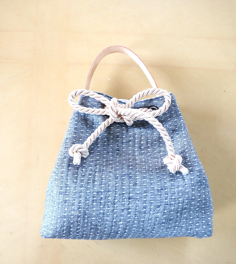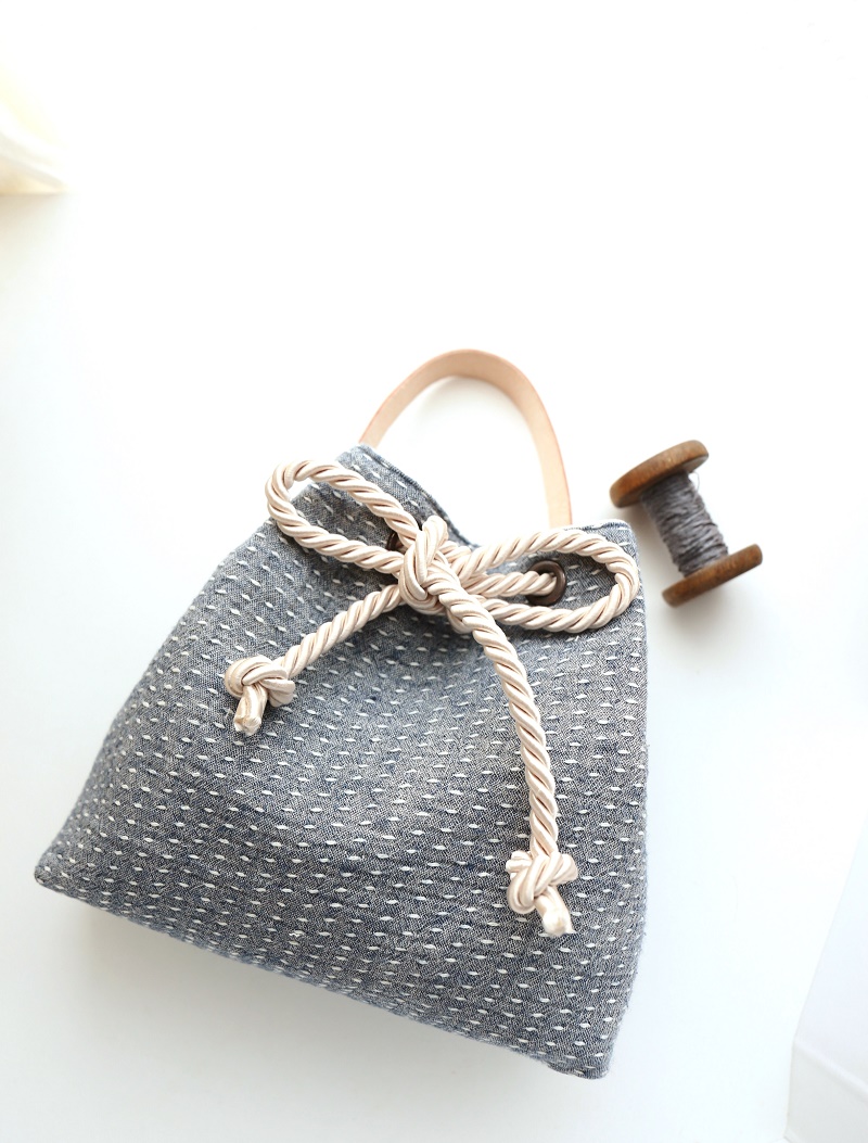 先染め刺し子風のダブルガーゼでつくった巾着バッグ。落ち着いた刺し子柄のスパイスになっているのが、ハトメとロープ、そして革テープでつくった持ち手です。和装はもちろん、カジュアルなデニムやナチュラルなワンピースにも似合います。
