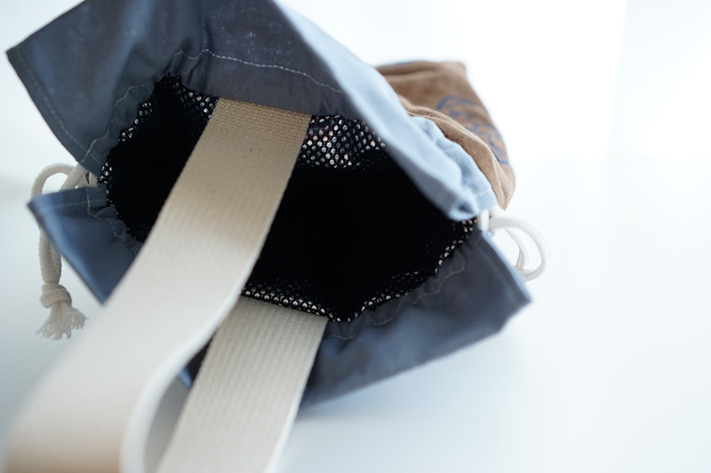 一見保冷バッグとは思えない、普段使いのできるおしゃれな巾着バッグに。口布を長めにとって、くしゅっと可愛く見えるようにしました。夏から秋にぴったりのツートンカラーと、シンプルな持ち手も気に入っています。500mlのペットボトル2本分の大きさです。