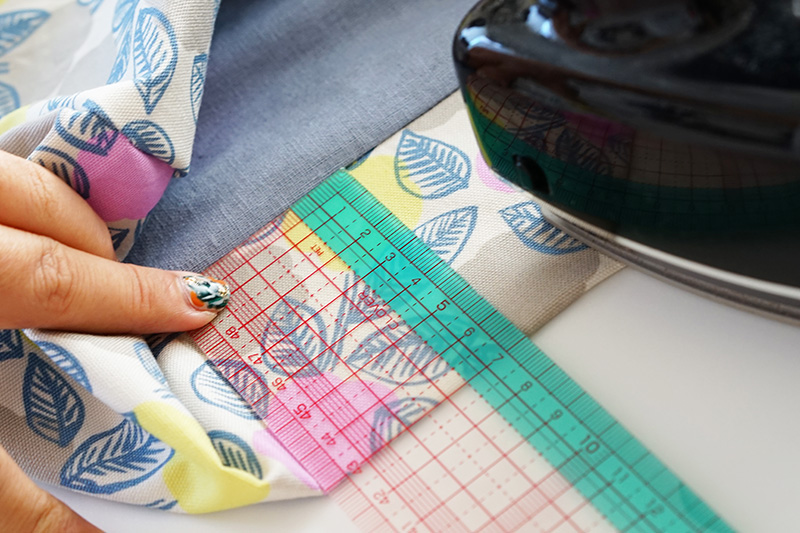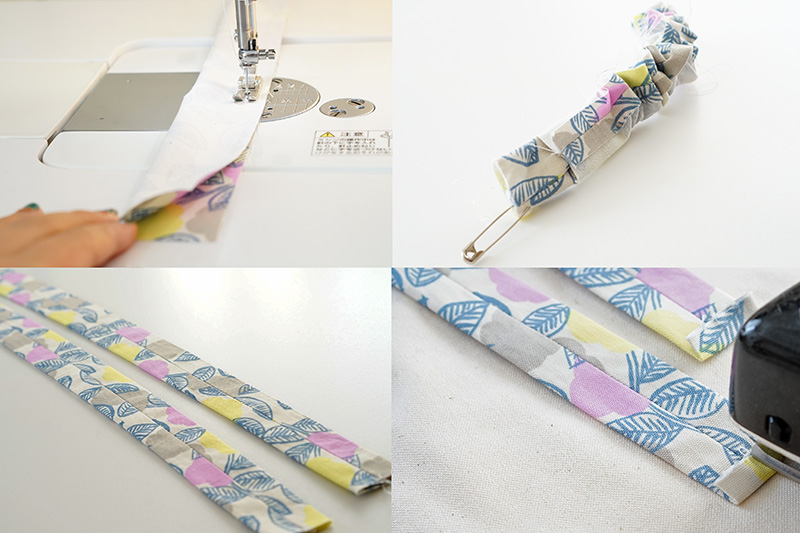 持ち手を作ります。縦半分で中表に合わせて縫い、縫い代を割って表に返します。端は1cm折っておきます。