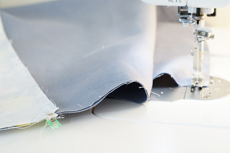表布同士、内布同士を中表に合わせ、底側を縫います。縫い代を裏布側に倒しておきます。