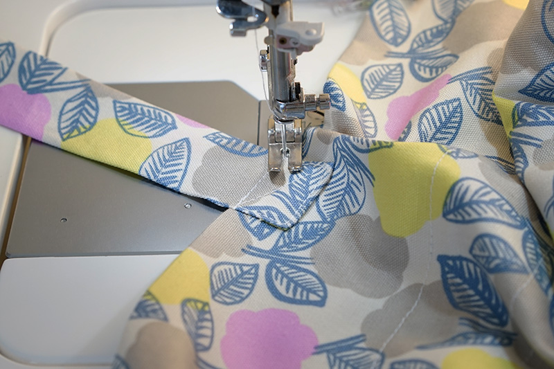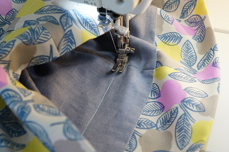 紐通し部分の長い直線は、後で消せるようなもので縫い線の印を書いてもよいですが、布端の位置に合わせてマスキングテープなどをミシンに貼り、目印をつけても、まっすぐ縫いやすいと思います。