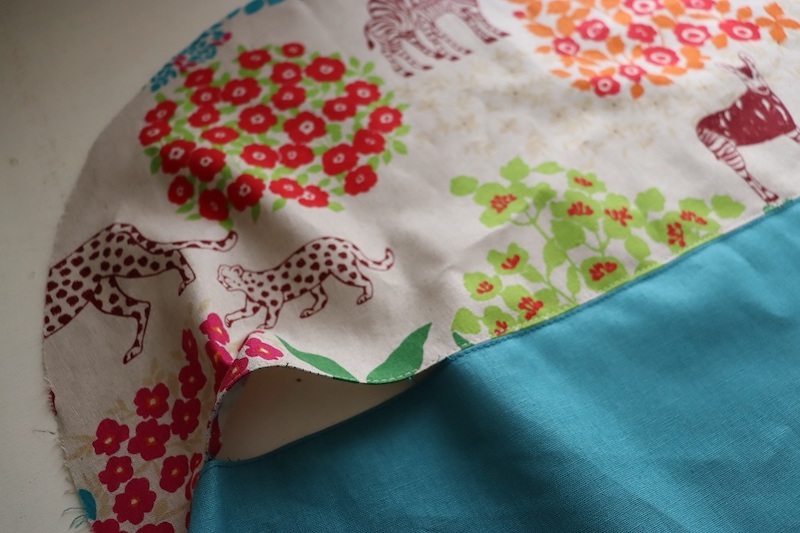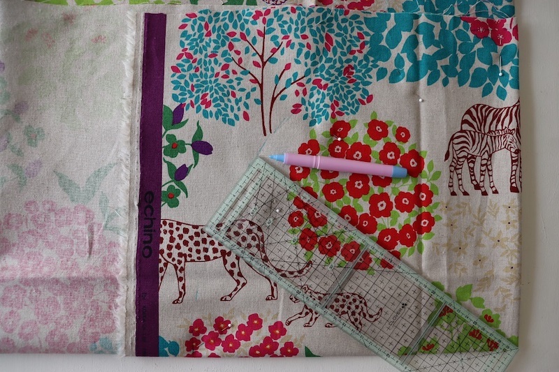 普段は大きな柄を中央に配置して裁断することはあまりしないのですが、今回は絞った時に真ん中にいちばん見せたい柄がくるように裁断しました。仕上がり時をイメージして作らないと、方向が変わってしまうので気をつけています。