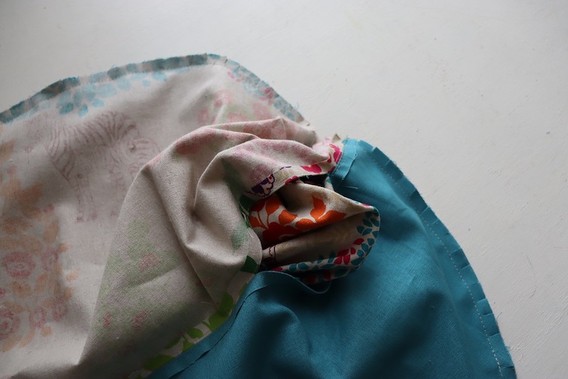 外面2枚を中表にして重ねます。返し口を10㎝ほど残して1㎝縫います。