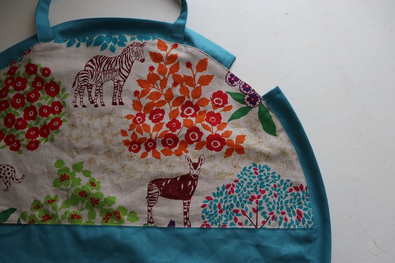 echinoのカラフルなデザインは、ちょっとビビッドな目を引くターコイズカラーにマッチ。これから春に向けて、広げて楽しめる巾着バッグをイメージして作ってみました。