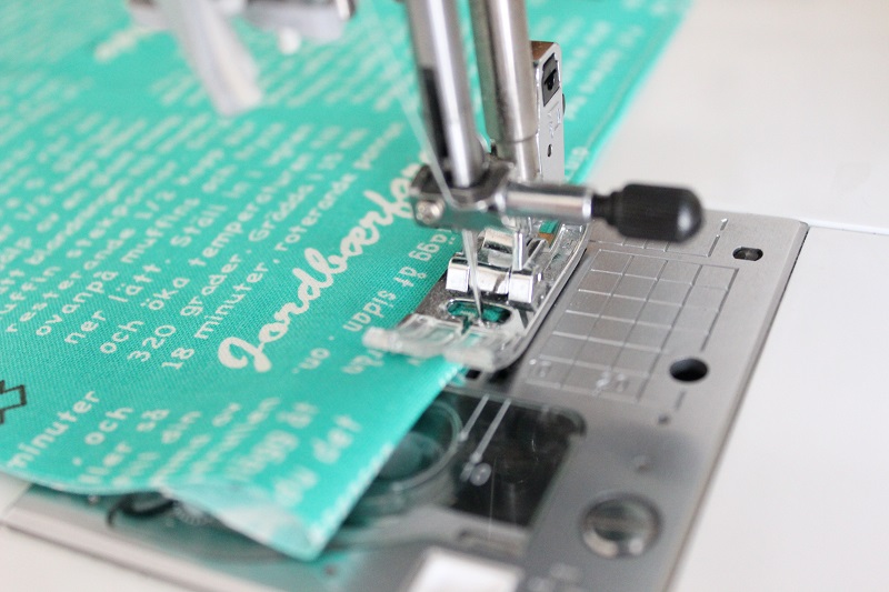 吊り下げポケットを作ります。輪にした部分を2mmのところでステッチ。