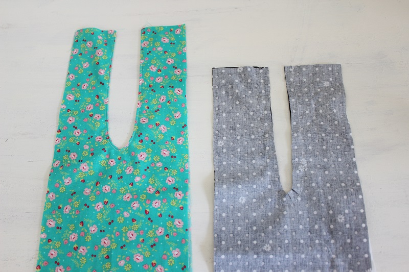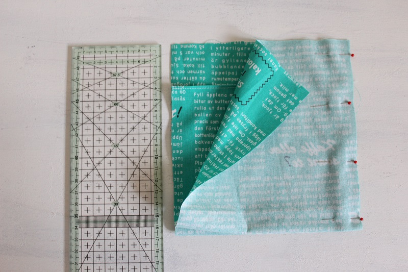 画像のように上から4cmのところに13で縫い合わせた輪の部分がくるようにしてから、両サイドをまち針でとめます。