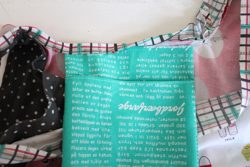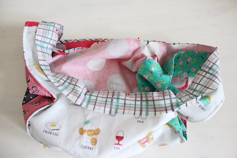 可愛いイラスト柄と、インパクトのあるビビッドなピンク。この柄を大きな面積で使って生かしてみたいと思いました。 その横に合わせる生地もそれぞれ見えた時に可愛い柄を合わせています。