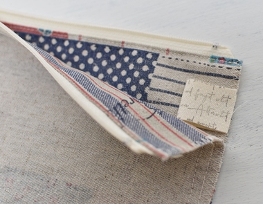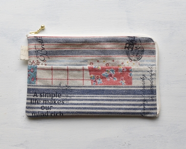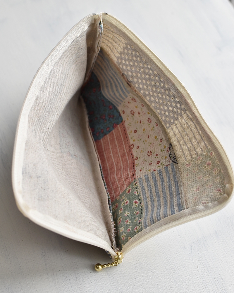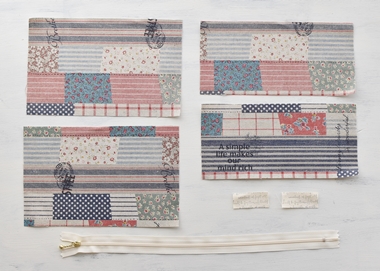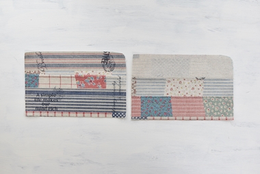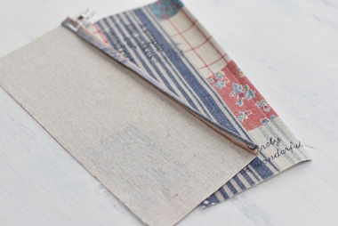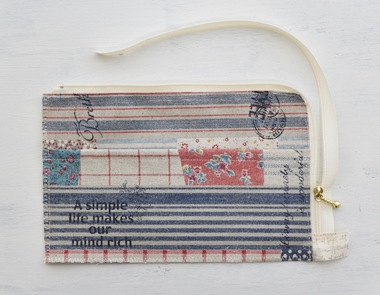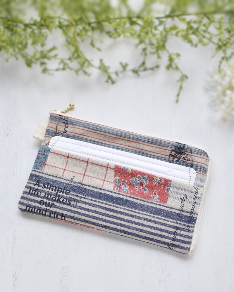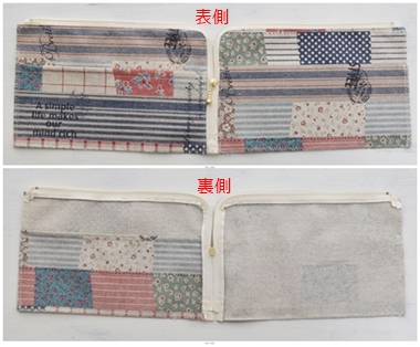 ポケットティッシュやリップ、マスクなど、外出時に持ち歩きたい衛生グッズが収納できるエチケットポーチです。使った布は「cloth Mix idee」シリーズのパッチワーク柄。コットン80%、リネン20%のキャンバス地はほどよい厚さなので、裏布なしで大丈夫。マスクがすっぽり収納できる大きさもポイントです。