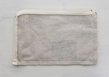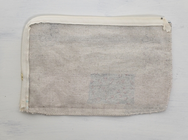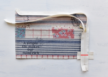 裁断する。※ファスナーはカットできるコイルファスナーを使います。無地の綿テープにスタンプをおしてみました。