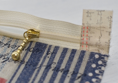 表布の前面とファスナーを縫い合わせる。終わりは2cm手前でしっかり返し縫いをし、ファスナーは必ずしめた状態で表布底部分の1cm上(赤い線)でカットする。※2cm幅の綿テープが表布とファスナーの間に入ります。