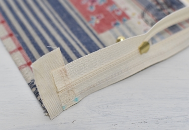 ファスナーからはみだした表布側の綿テープをカットし、縁かがりミシンをかけて布端のほつれ止め処理をする。