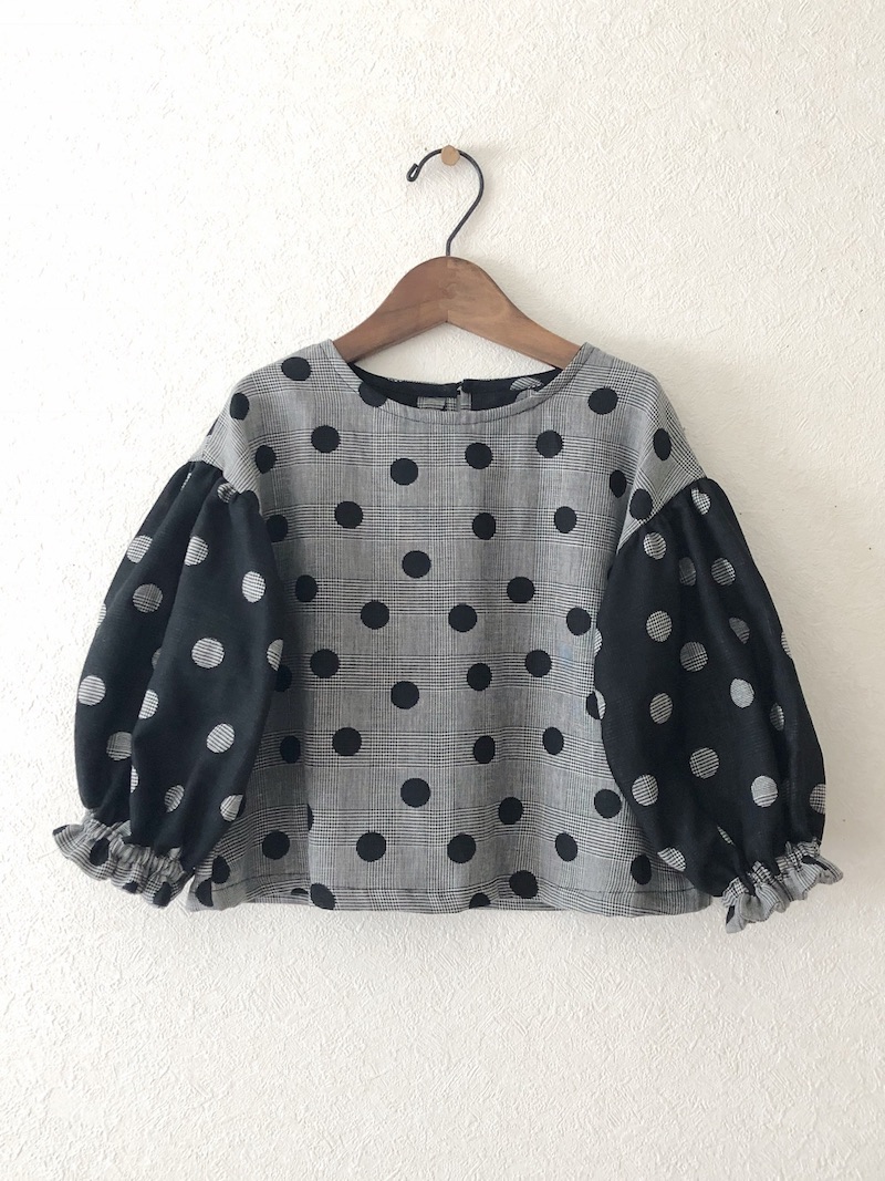 ふんわりとした袖が愛らしいキッズ用のブラウスです。使った布は表も裏も両方楽しめるリバーシブルプリント。身頃と袖口は表、袖は裏を使ってツートーンのコンビネーションに仕上げました。ダブルガーゼ素材なのでゆったり。着心地の良さもうれしい一着です。
