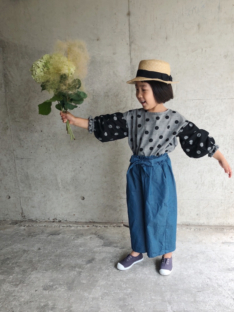 長袖ですがダブルガーゼ素材でゆったりしていて、袖口もゴムでまくれるので秋に向かっていく季節にぴったりのお洋服だと思