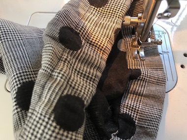 袖口別布を表に返し、アイロンで押さえる。別布のキワをゴム通し口2cm開けてぐるりと縫う。