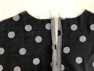 後ろ中心を縫い止まりまで縫い合わせ縫い代割る。開き部分縫い止まりまでを三つ折りにしてステッチ。