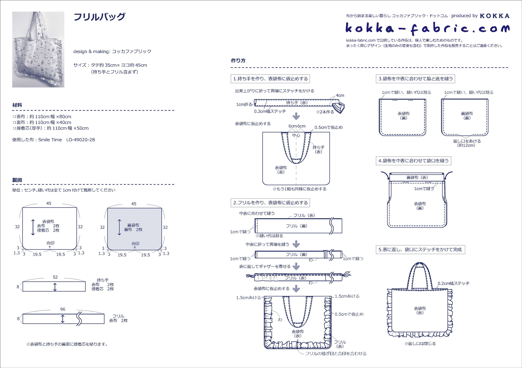 バッグの側面と底にぐるりとフリルをつけた可愛いバッグは、通園通学グッズのレッスンバッグにもぴったり。使った布はSmile Timeシリーズ、おいしそうなパフェやポップコーンがちりばめられた小柄プリントです。