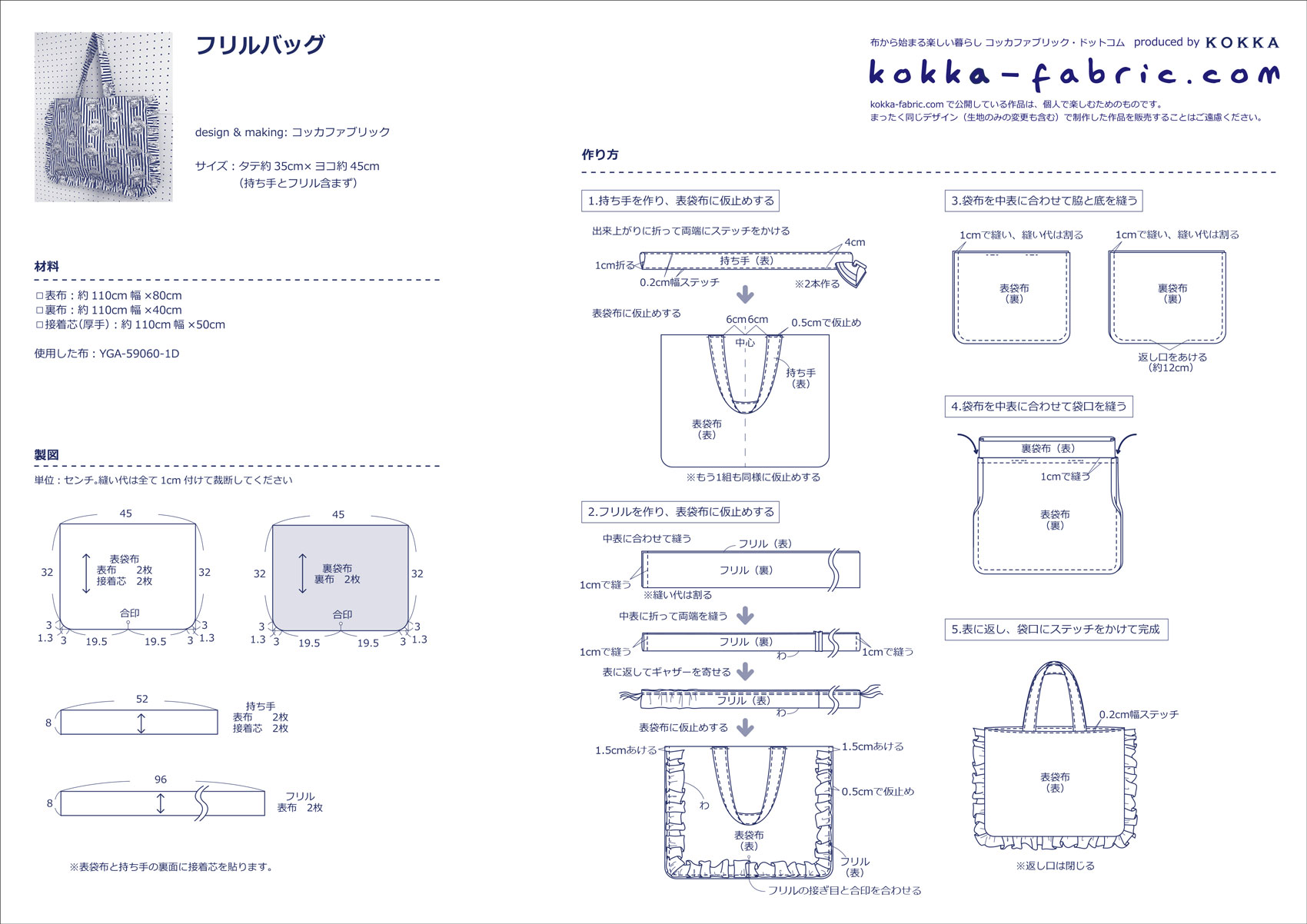 バッグの周りにぐるりとフリルをつけたデザインがとってもキュートなバッグです。通園や通学のレッスンバッグにもちょうどよい大きさ。使った布は「Wonder Closet」シリーズ。パフェに入ったネコちゃんの柄が上下両方を向いているので、布の天地を気にすることなくバッグづくりができます。コットン100%のオックスフォードはとっても縫いやすいので、ソーイングビギナーさんも安心です。