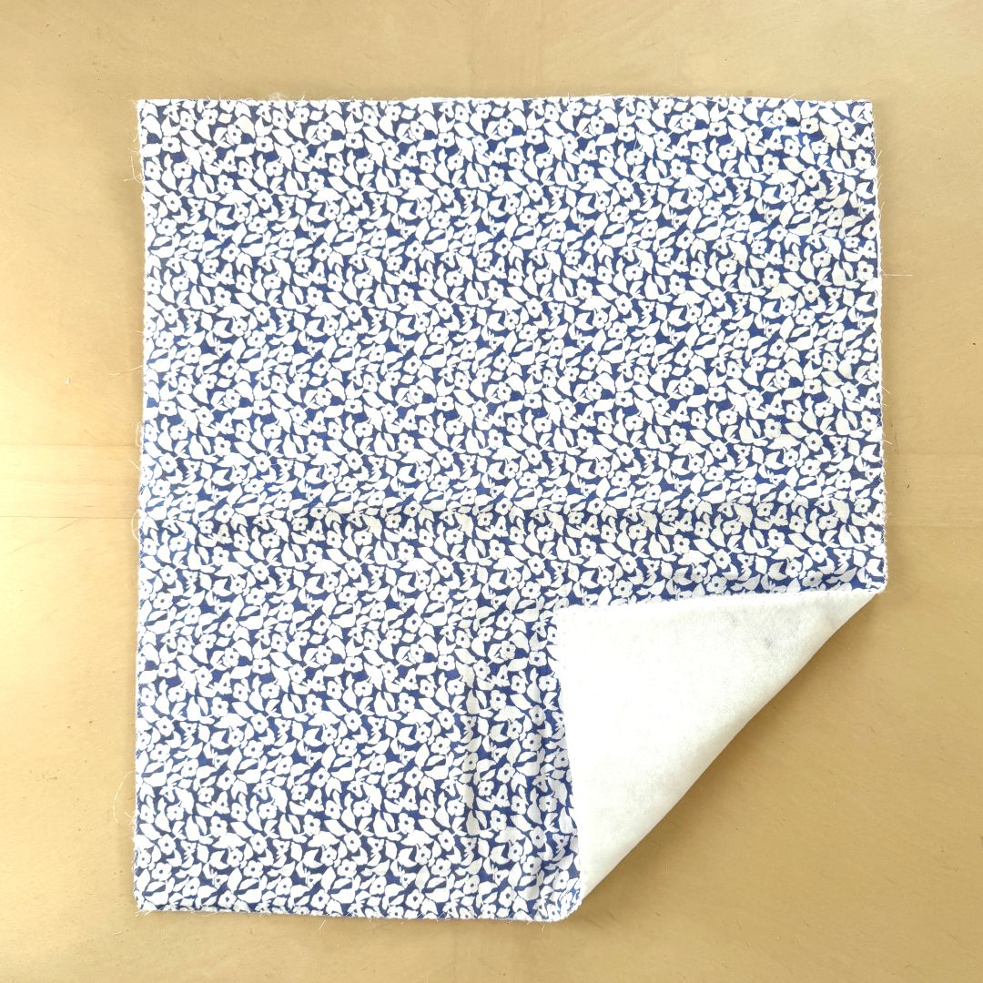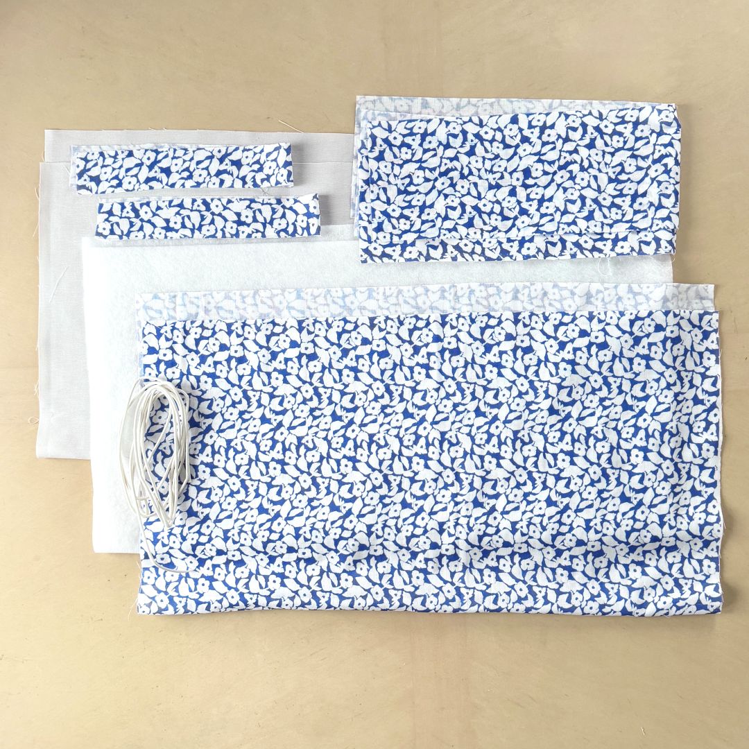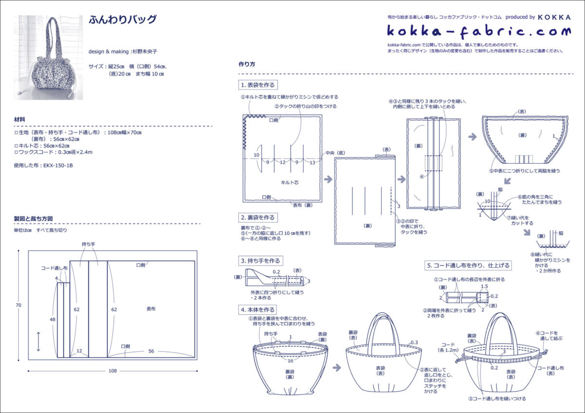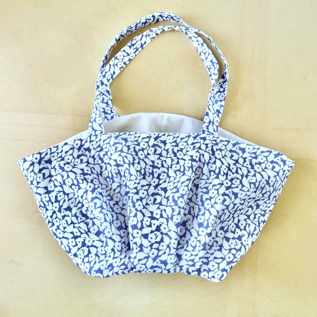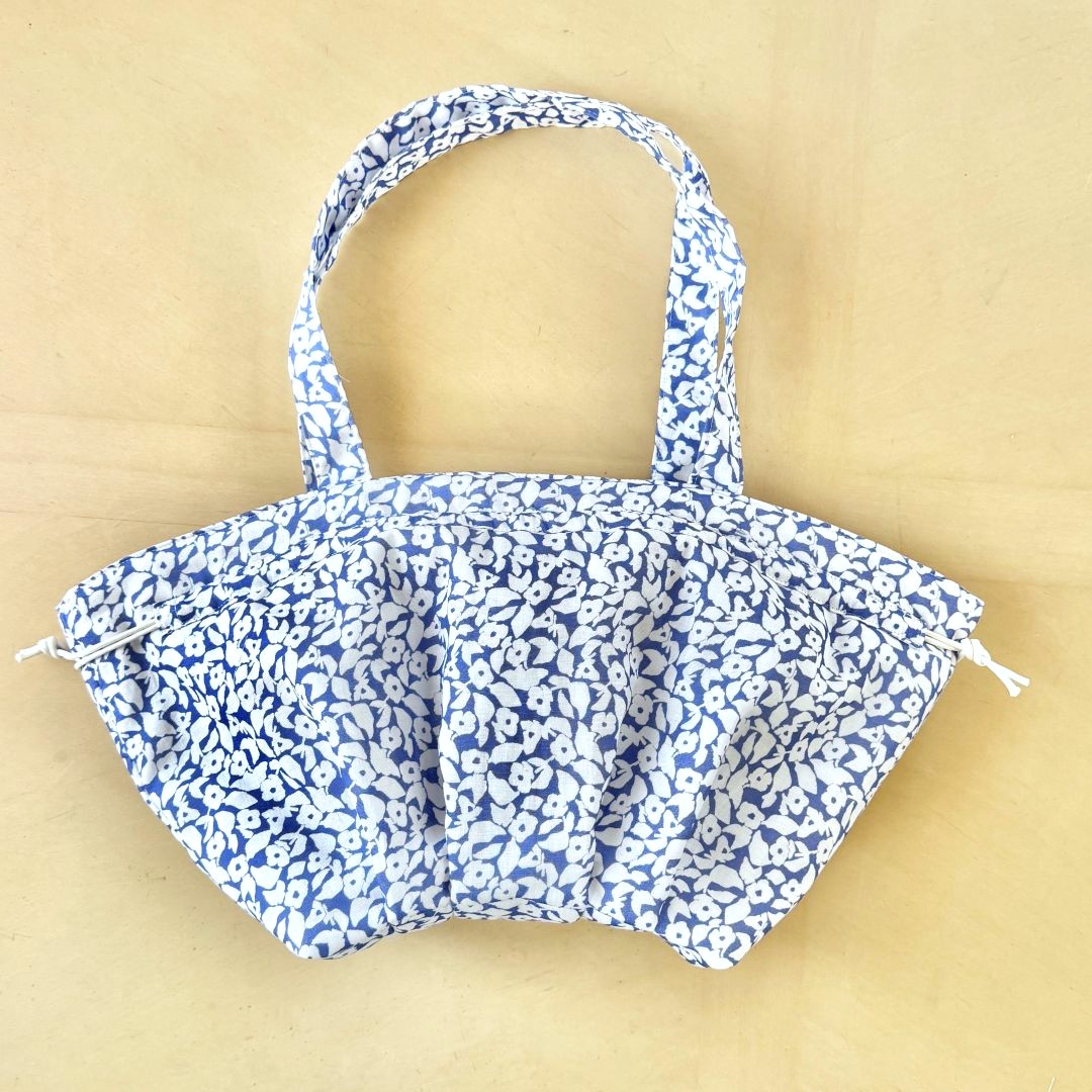ダブルガーゼの柔らかさを生かした丸みのあるバッグです。キルト芯を重ねて、底にタックを入れることで、ふっくらした仕上がりに。作品に使った布は、MUDDY WORKSの[White Kerria]。ブルー地に白が生える爽やかな柄です。ダブルガーゼなのでお洋服づくりにもおすすめです。