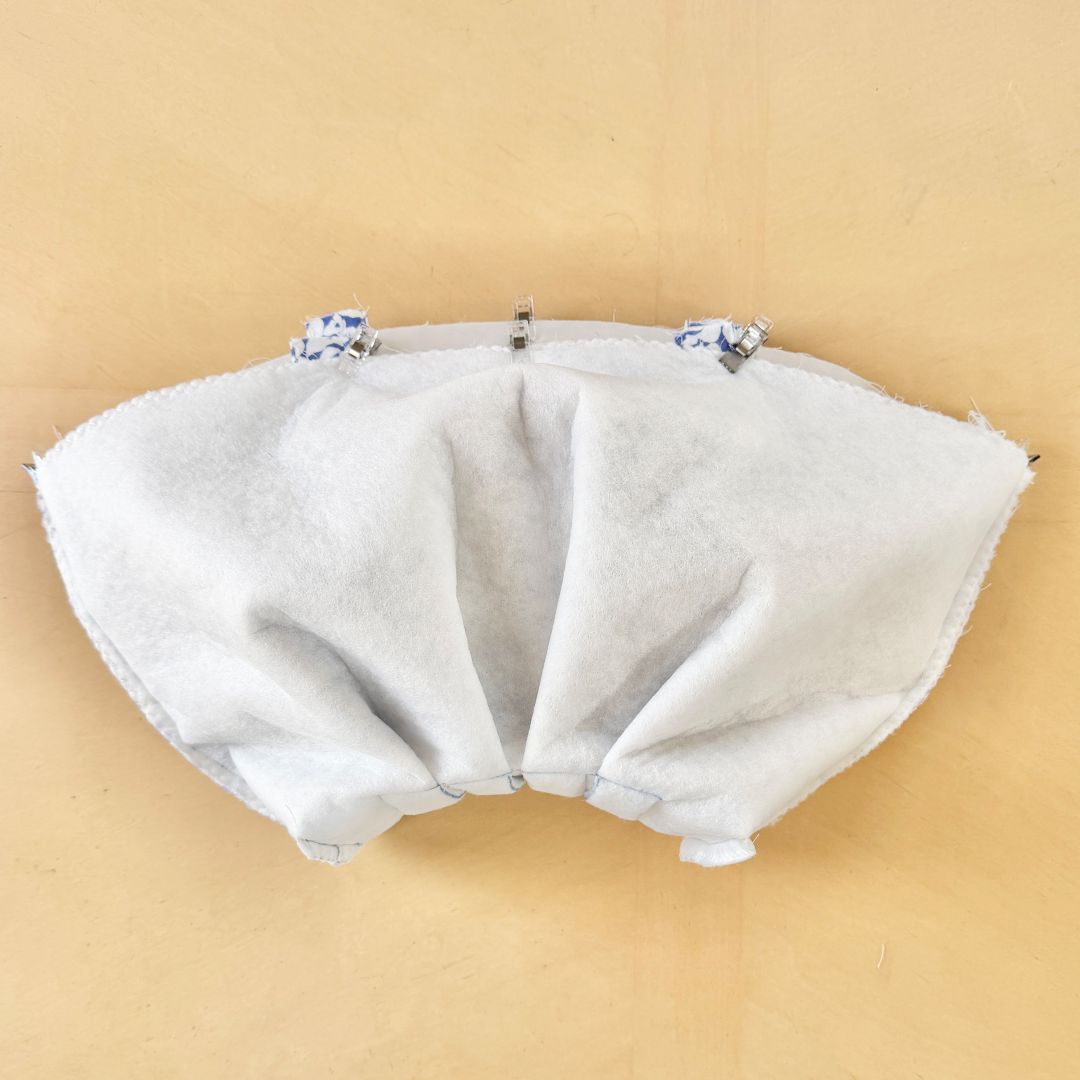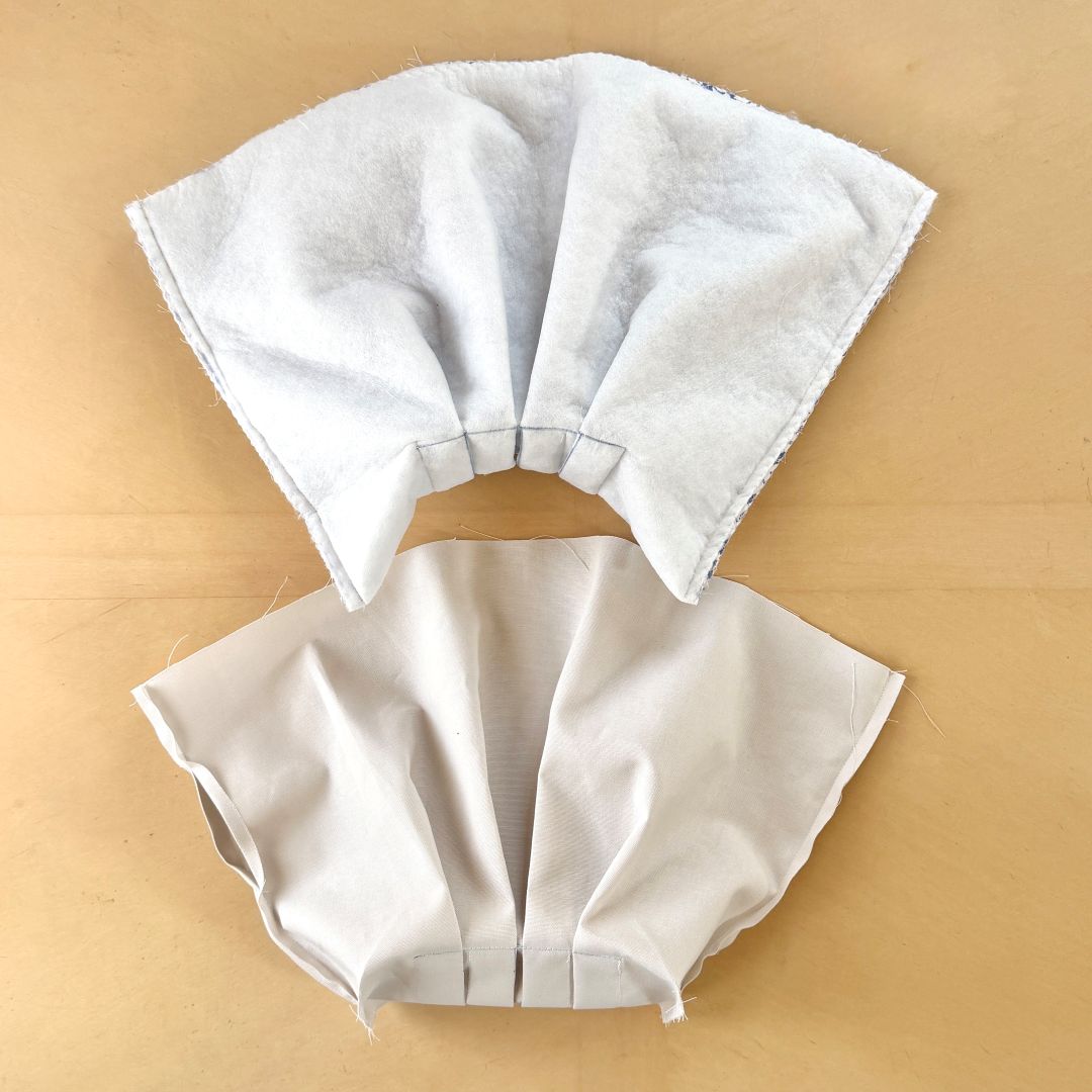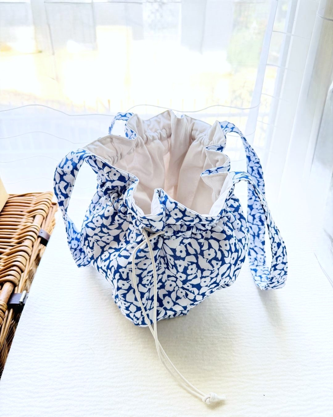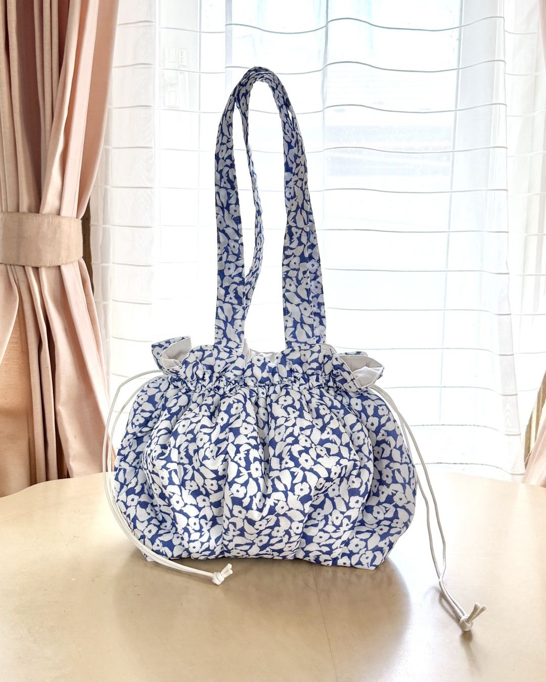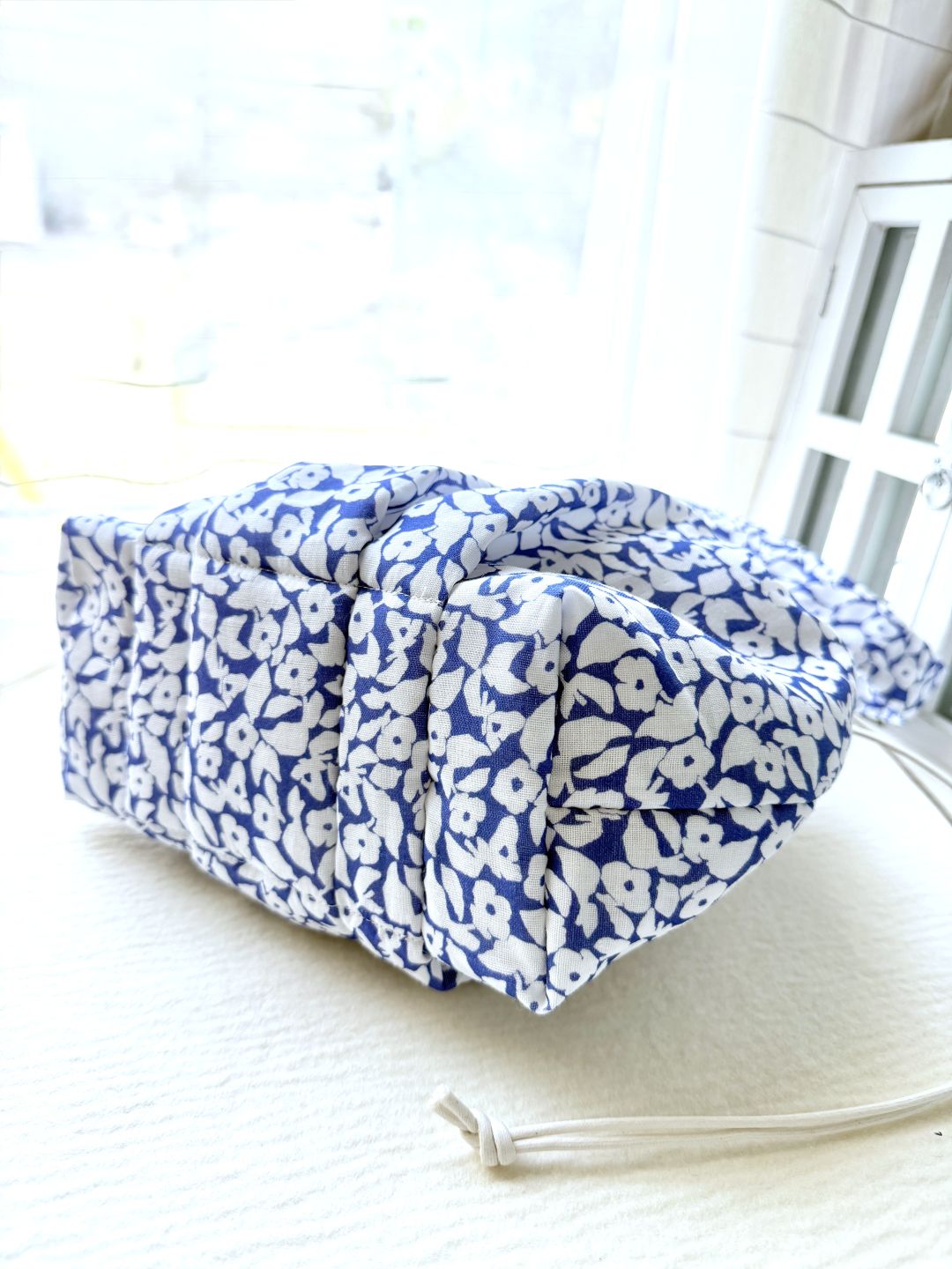ふわんとした雰囲気を出すために、キルト芯を重ね、底にはタック、上部は巾着にしました。楽に持ちたいので、肩にもかけられるようにハンドルは長めです。