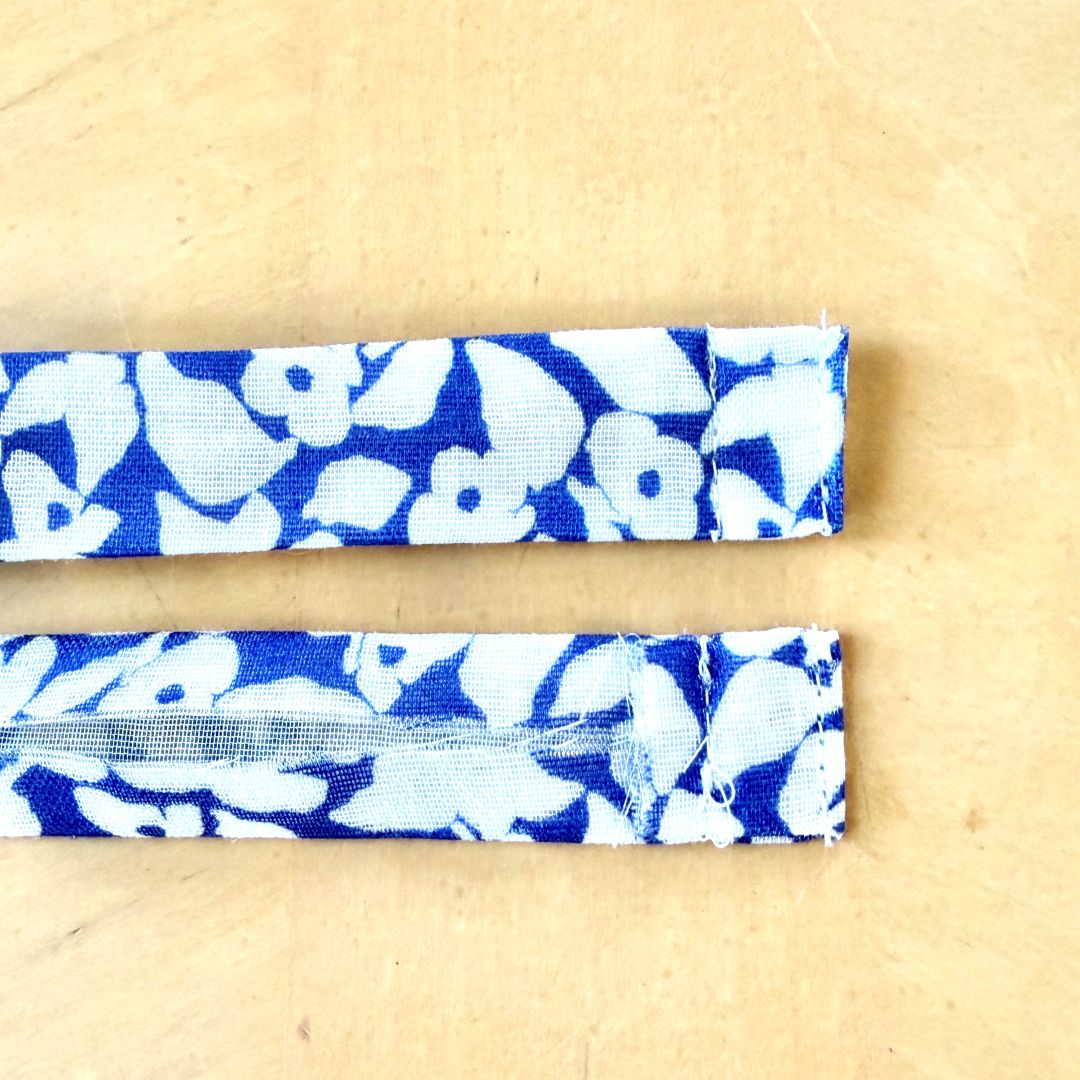 ひも通し布の長辺を突き合わせで折り、両編を2cm折って本体に縫いとめます。