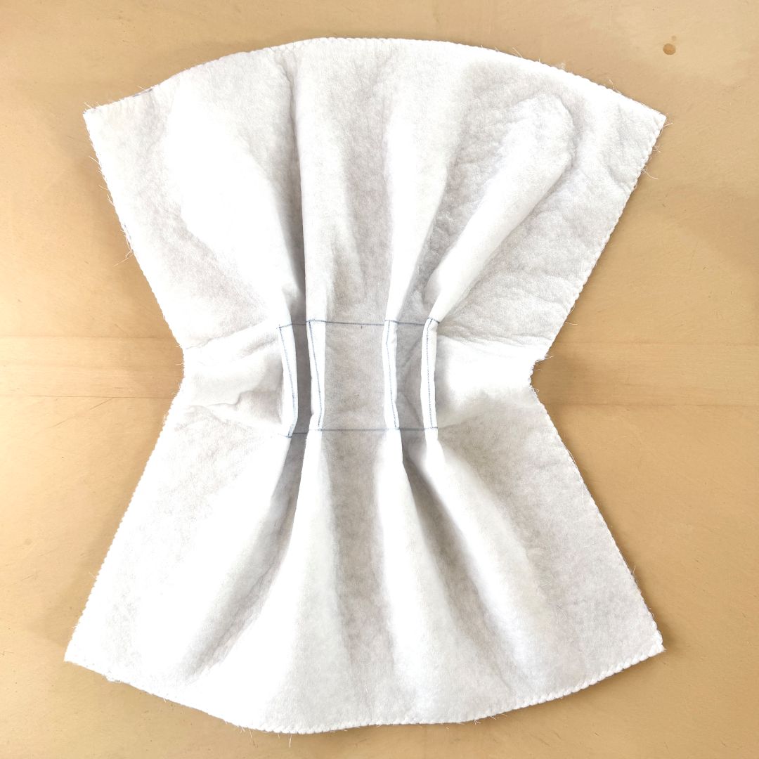 タックをしっかり折って、倒して縫い押さえることで、底がしっかりします。コード通し布は細めなので、コードを通しやすいように縫い線をあまり内側にしないよう気をつけてください。