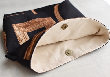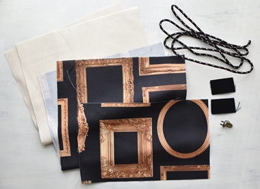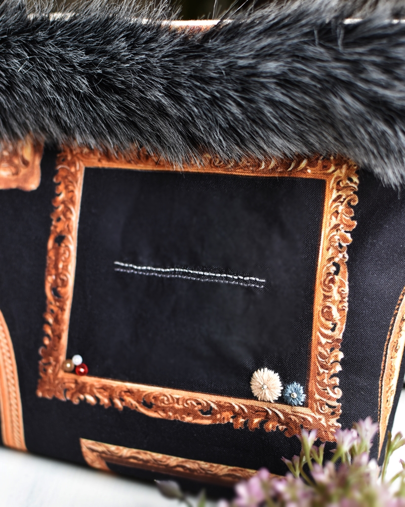 四角や丸の素敵なアンティークフレームが並んだ柄だったので、どの部分を使おうかとあれこれ楽しく選んで裁断しました。フレームの中を自由に遊べるユニークな柄だったので、刺繍を施したりボタンをつけてみました。
