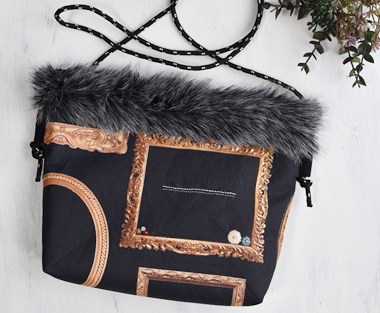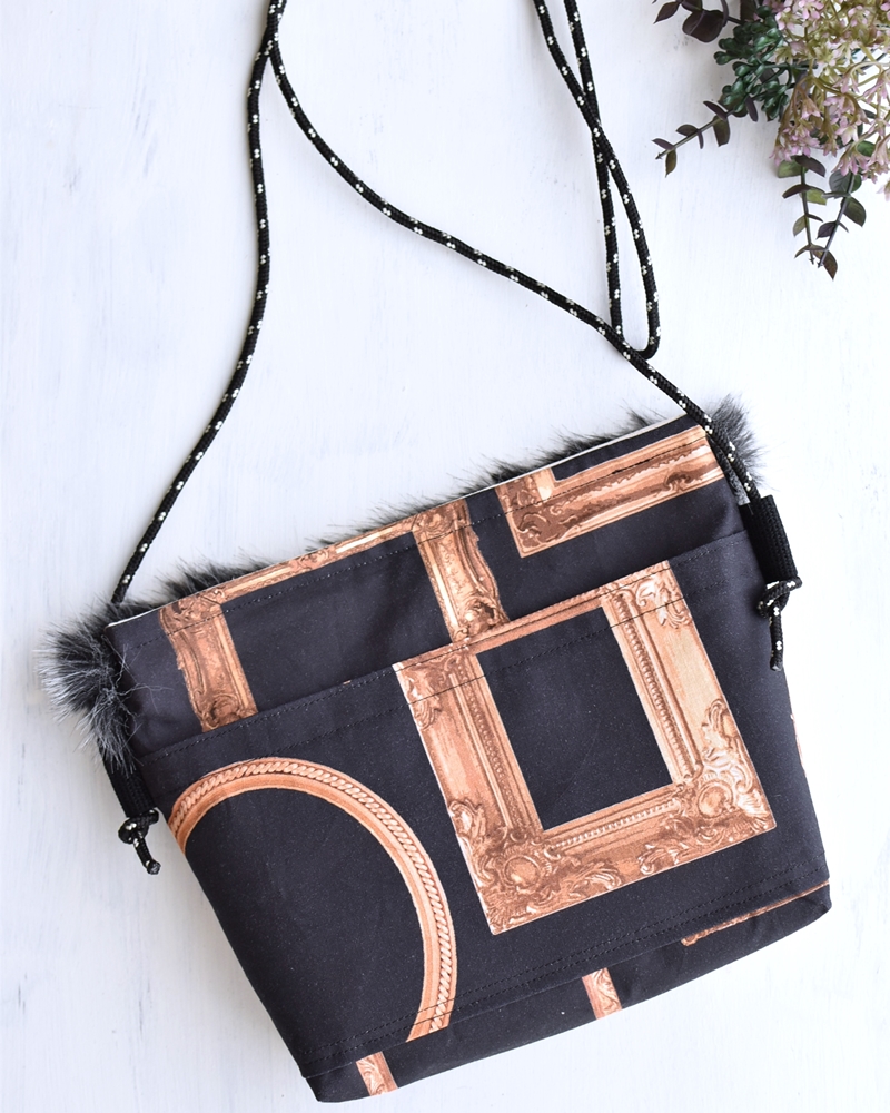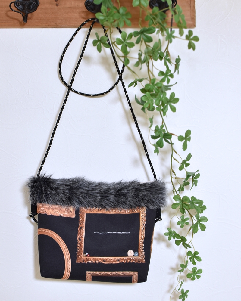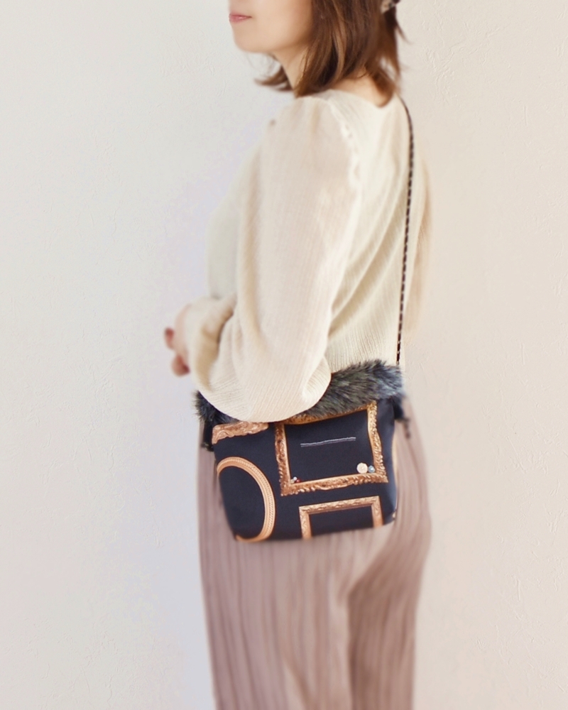 あったか素材のファーつきサコッシュです。カジュアルアイテムのサコッシュも、ファーをあしらえばフェミニンな印象に。こちらの生地は、「Reminiscence」シリーズの[frame]。コットン100%、シーチング、インクジェットプリントです。
