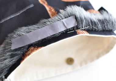 ファーテープを粗く縫い留めます。画像のようにマスキングテープでファーの毛をおさえながら手縫いをすると縫い糸に毛が絡まず、スムーズに縫えます。