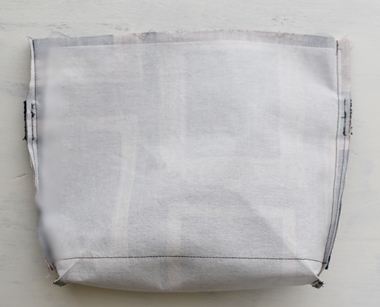 表生地を中表で半分に折り両脇を縫います。マチ5cmになるように底を縫います。※マチ部分は7mmほど残してカットし、ジグザグミシンをかけるとすっきり落ち着きます。