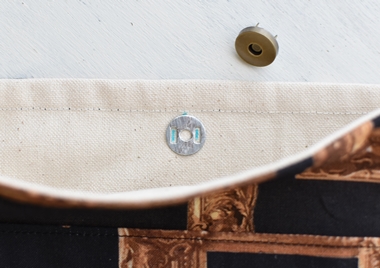 返し口から表に返し、口部分から1cmのところぐるっと一周縫います。内側にマグネットボタンをつけます。差し込み型の場合は座金を使っての穴のところに印をつけ、目打ちとハサミで小さく差し込み穴をあけます。※返し口から手を入れて裏側の作業をします。