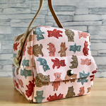 街並にワンコがひょっこり顔を出す楽しげなプリントは、IHME CHAMBERシリーズの「ワンだふる仕掛けの街」。インパクト大の総柄を活かしたギャザ―スカートは、ヨークを作ってウエストスッキリ、さらにパイピングテープ使いでワンランク上の仕上がりに。コットンリネンのキャンバス地なので、バッグや小物づくりにも向いています。