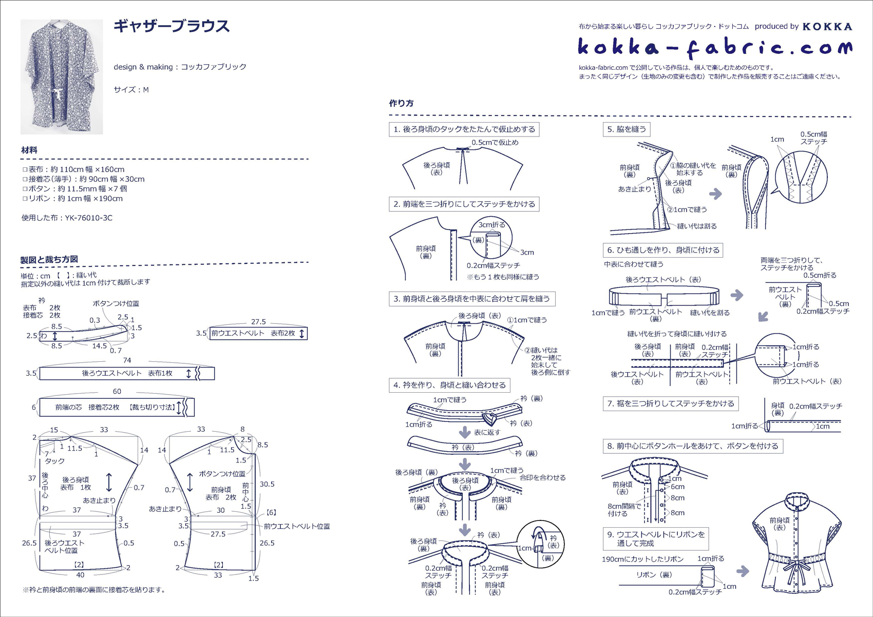 肩から袖が1枚の生地でつながっているラグランスリーブのブラウスです。ウエストをきゅっとリボンでしばるのがポイント。裾が長めのデザインは、デニムのボトムスと合わせればカジュアルに、ロングスカートと合わせるとフェミニンな印象になります。使った布は「FLOWER GARDEN」シリーズ。綿麻シーチングの小花柄です。