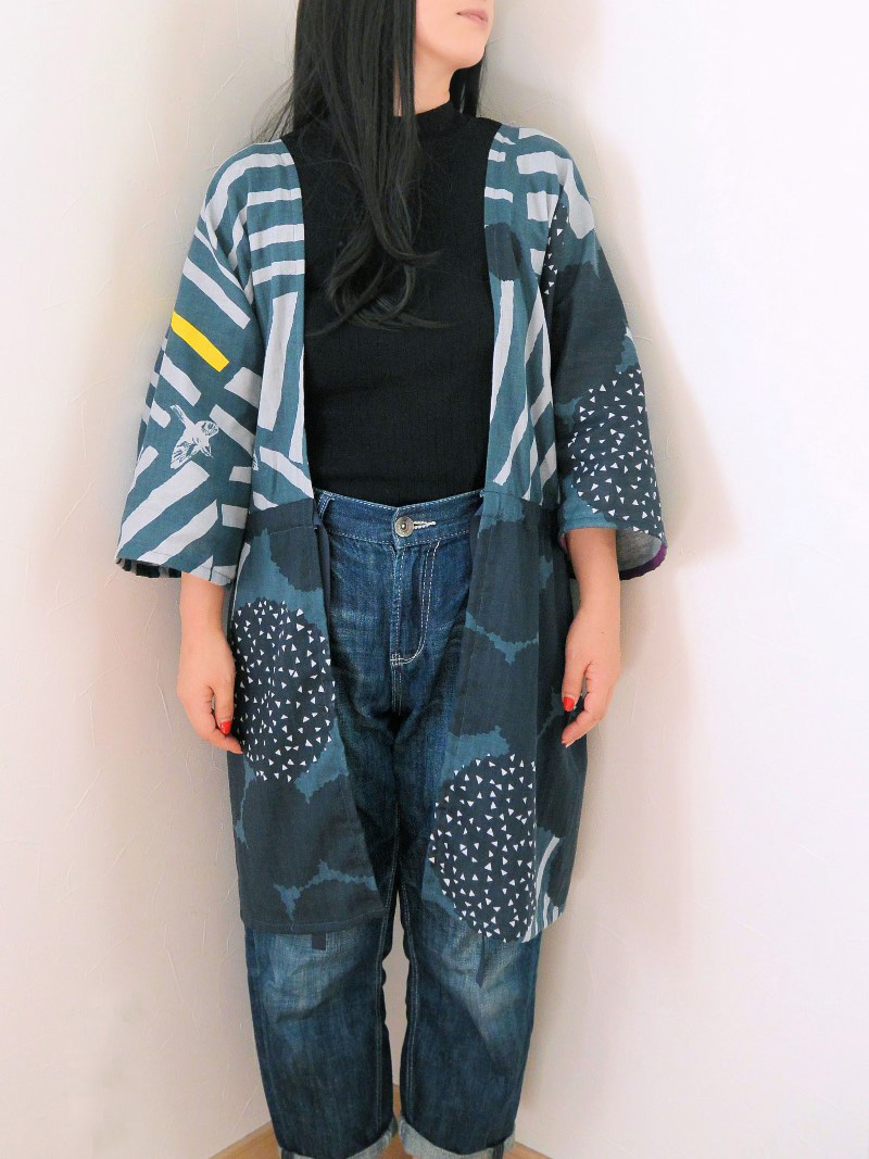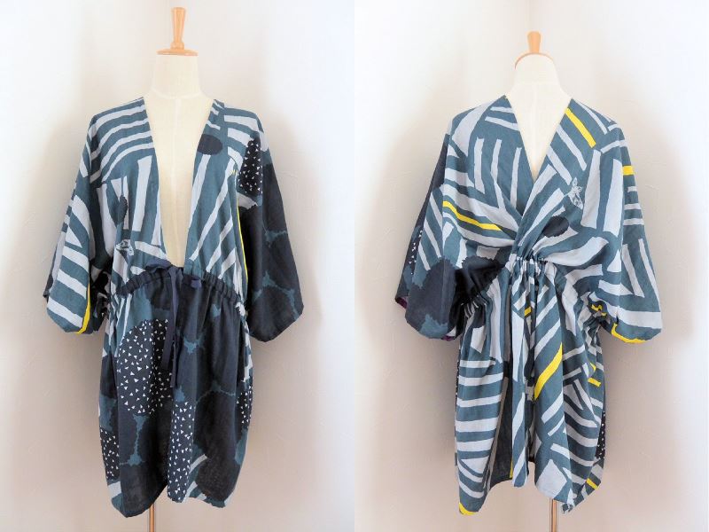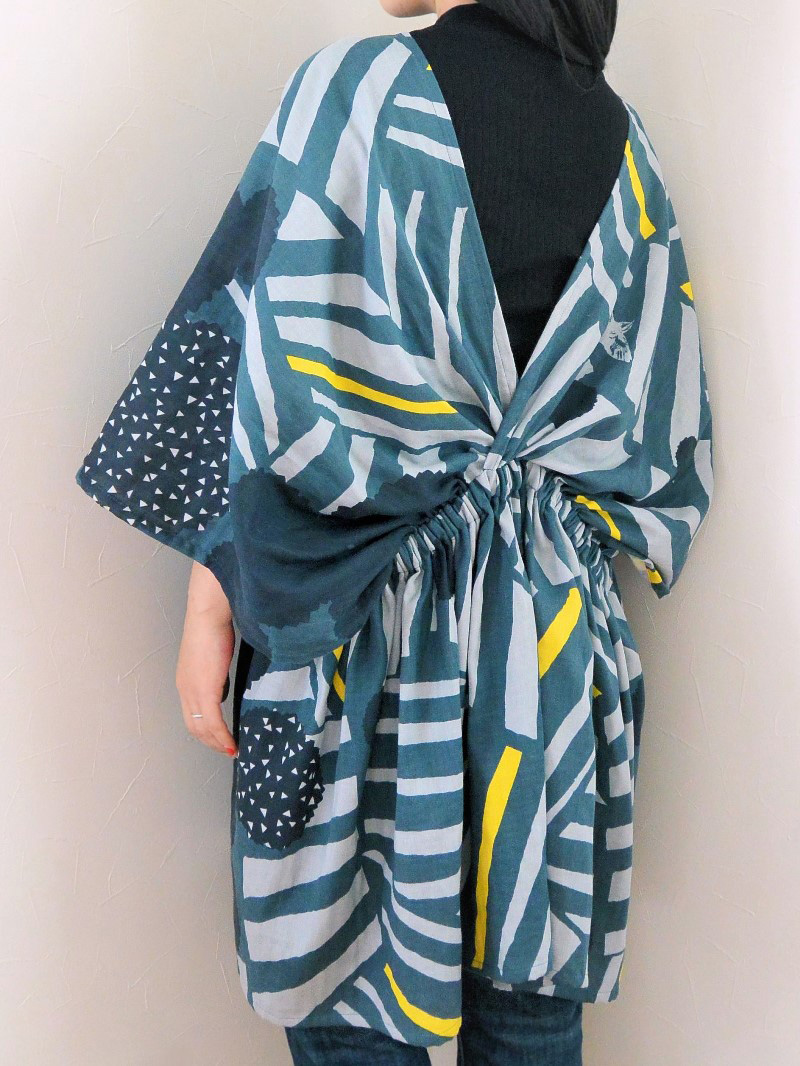 左右対称ではない大きな柄配置を利用して、後ろ姿に比べるとシンプルな前の印象に面白味を持たせるようにしてみました。