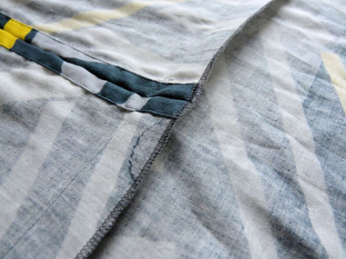 トップスとスカートとそれぞれ端の始末をしてから縫い合わせた所です。縫代を大きくとってリボンの通り道を兼ねてしまうという、とってもお手軽な方法で作っています。洋裁のセオリーにはないかと思いますが、賢い手抜きです!