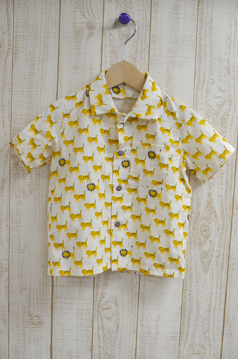 ダブルガーゼのプリント柄、トレフルキッズを使った子ども用の半袖シャツです。使った布は「ネコ時々ライオン」。一列に並んだネコのなかに、たまに現れるライオンがなんともおちゃめ。ライオンのたてがみと色を合わせたボタンが可愛らしいアクセントになっています。