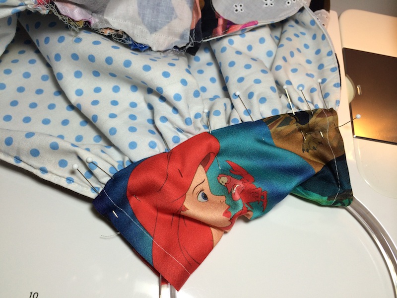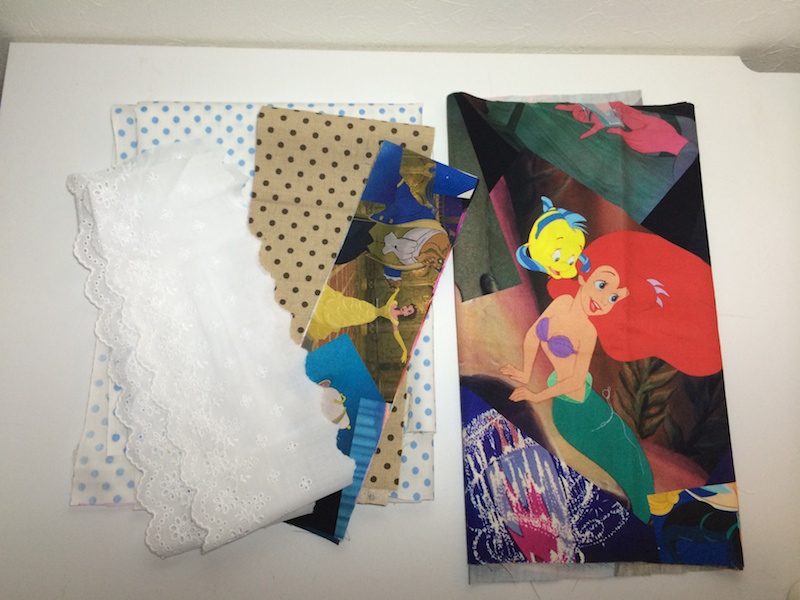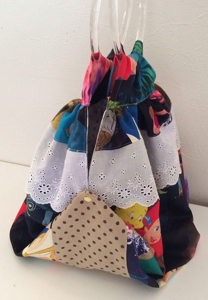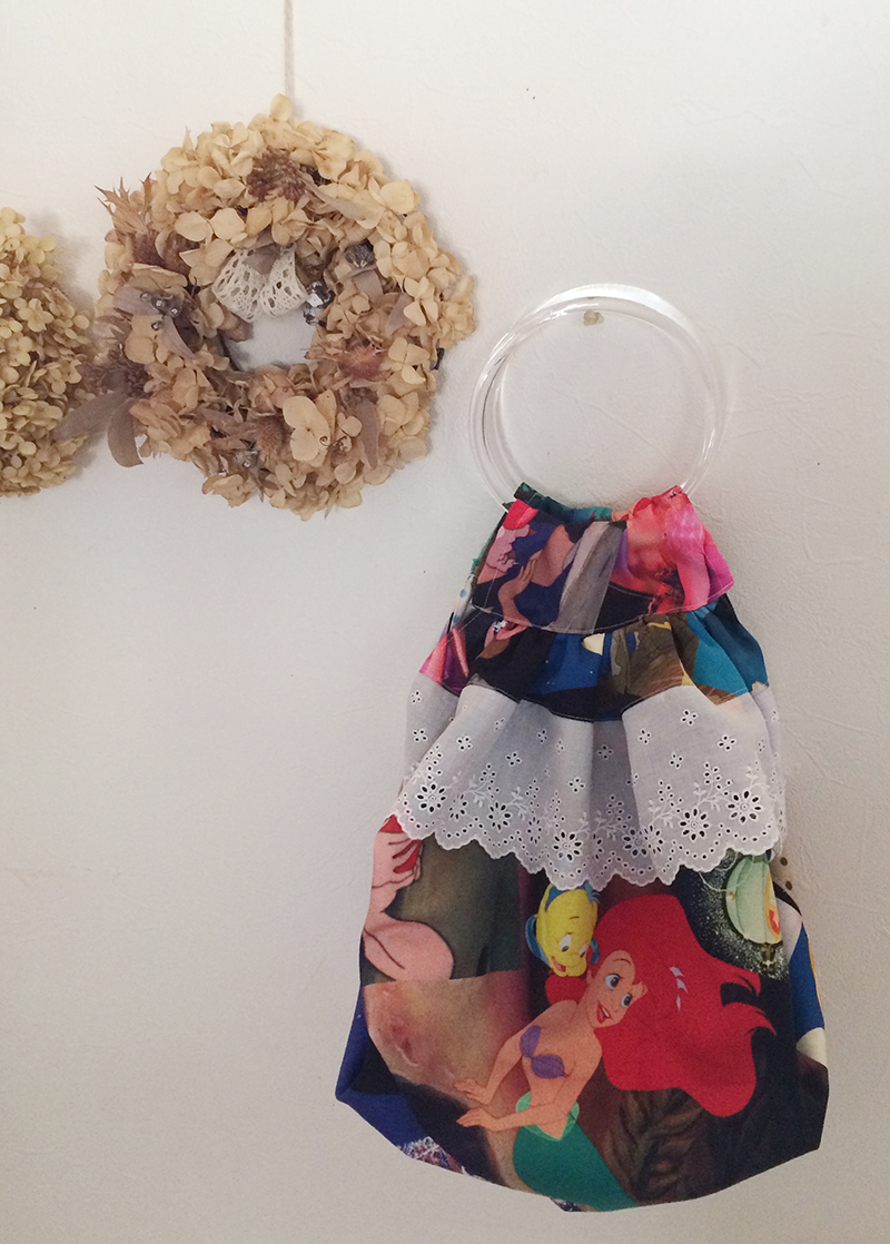 デジタルプリントのプリンセスシリーズで作ったバッグです。透明なハンドルとレースでガーリーに仕上げました。好きなプリンセスが表布にくるように、あれこれ柄取りを考えるのも楽しそう。写真のバッグは、マーメイドを主役にしました。作ってくれたのは、斉藤真澄さんです。