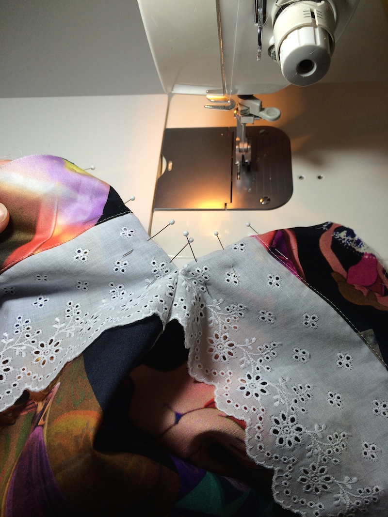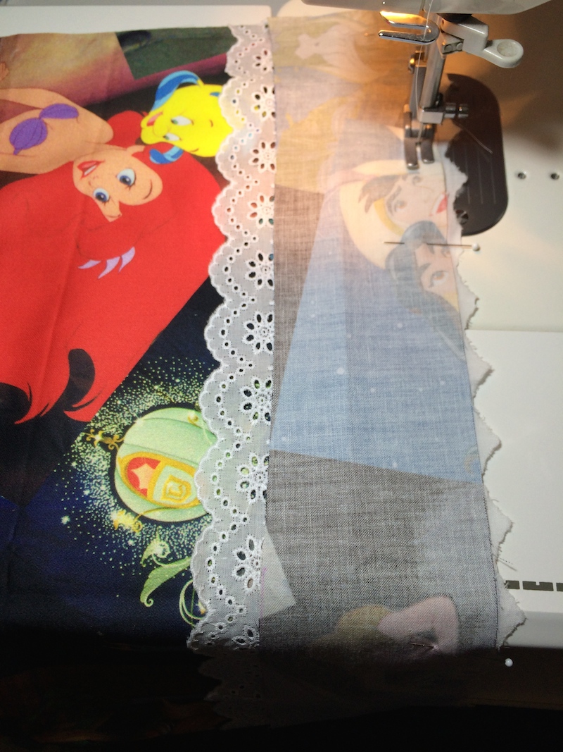 側面a・bを中表に合わせ、レースを挟んで縫う。(2枚とも)。底布もつなげる。